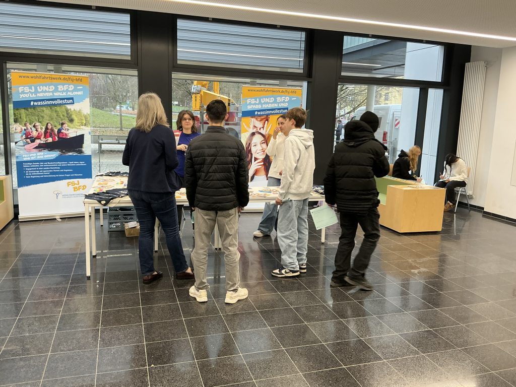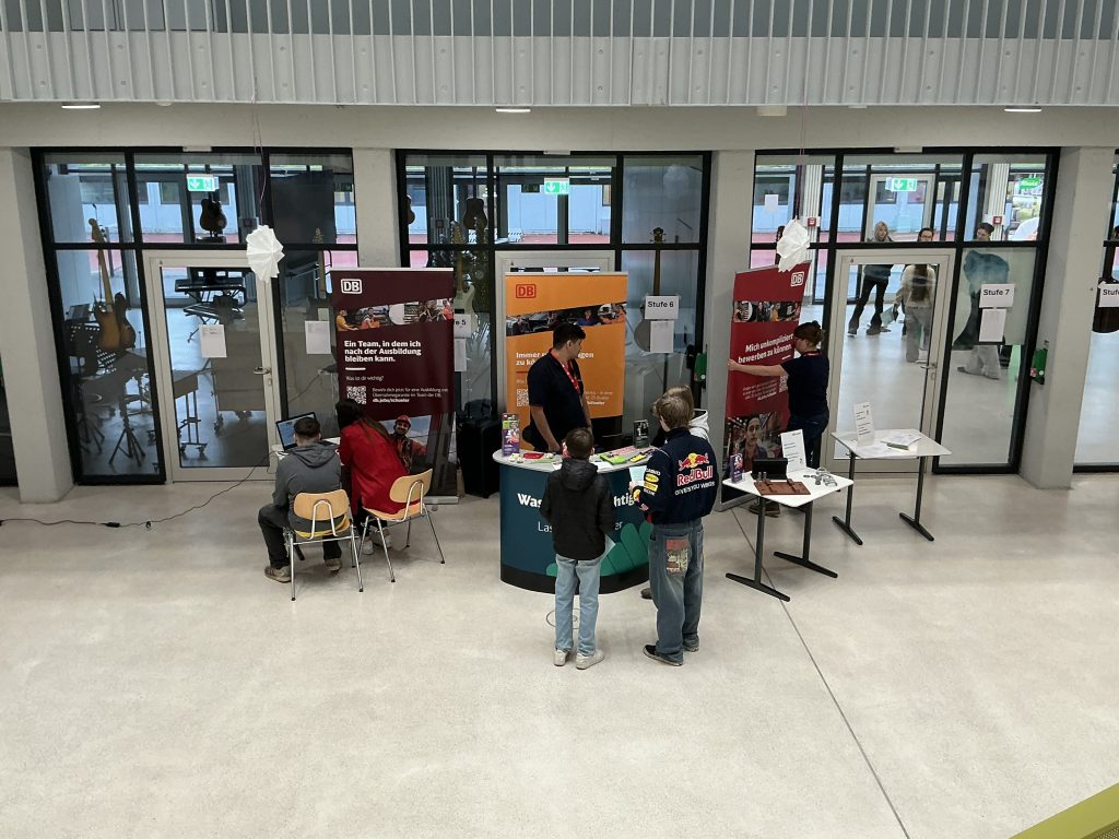 Am Freitag, den 28.11.25 fand an unserer Schule ein Berufsinformationstag statt. Zahlreiche regionale Unternehmen, Ausbildungsbetriebe und soziale Dienste stellten sich vor und gaben unseren Schülerinnen und Schülern Einblicke in verschiedene berufliche Perspektiven. In persönlichen Gesprächen konnten die Jugendlichen wertvolle Informationen sammeln, Fragen stellen und erste Kontakte zu potenziellen Ausbildungsbetrieben knüpfen. Von technischen und handwerklichen Berufen über soziale und kaufmännische Bereiche bis hin zu FSJ-Möglichkeiten war für jede Interessensrichtung etwas dabei.
